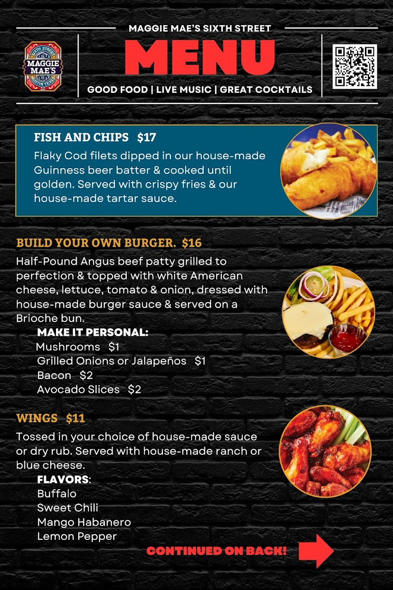 The menu at Maggie Mae's offers a laid-back selection of casual bites and thoughtfully crafted drinks that perfectly complement the upbeat vibe of this lively bar and night club. Whether you're settling in for live music or enjoying time on the rooftop with friends, you can expect straightforward, satisfying options designed to keep the good times rolling.
